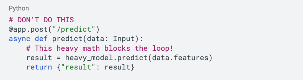When you run a heavy matrix multiplication inside an async def function, you are effectively grabbing the event loop by the throat and refusing to let go until the math is done. The event loop can’t check in new guests because it’s busy doing math. Your API isn’t concurrent anymore because it being blocked.