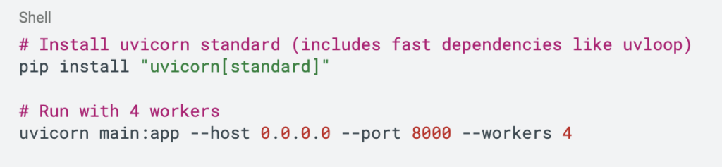 To fix this, we use uvicorn with multiple workers. The general rule of thumb is (2 * CPU cores) + 1, but for heavy ML models, we prefer starting with 1 worker per core to avoid context-switching overhead. Here is how you run it for a 4-core instance: