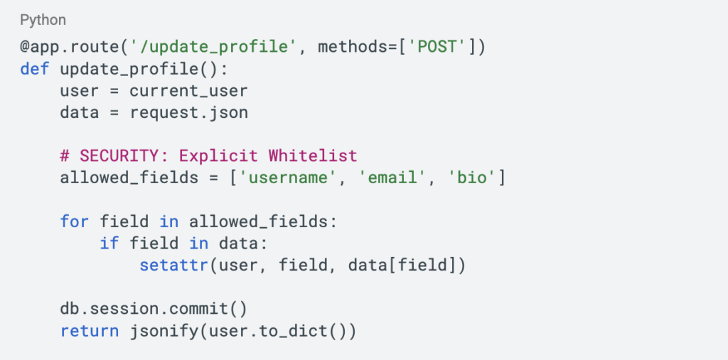 - Refinement: “Based on your critique, rewrite the code to use a whitelist of fields.”